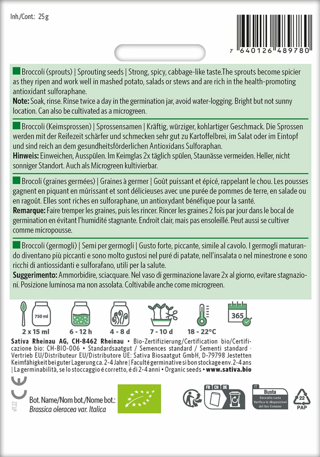 Broccoli Keimsprossen besitzen einen kräftigen und würzigen Geschmack, der etwas an Kohl erinnert. Je länger die Sprossen reifen, desto schärfer werden sie. Ganz hervorragend schmecken sie zu Kartoffelbrei, Salaten oder Eintöpfen.