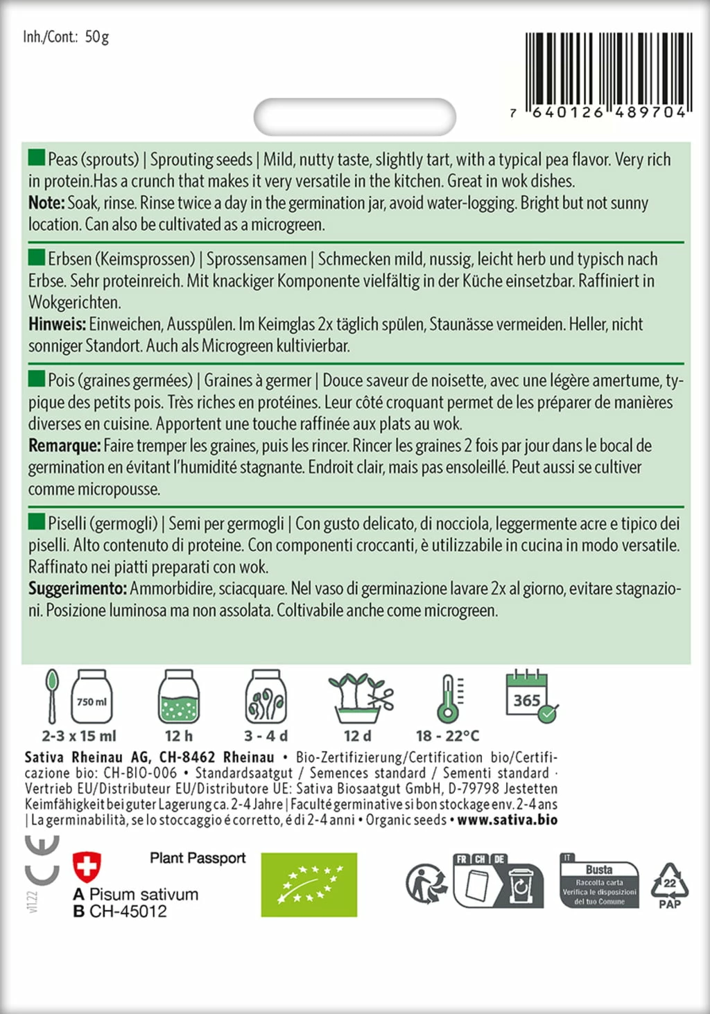 Die knackigen Erbsen-Keimsprossen haben einen wunderbar mild-nussigen Geschmack und können auch als Microgreens gezogen werden. Das leicht herbe Aroma erinnert an die ausgewachsene Version. Ein vielfältiges Kraftpaket, das vor allem in Wokgerichten glänzt.
