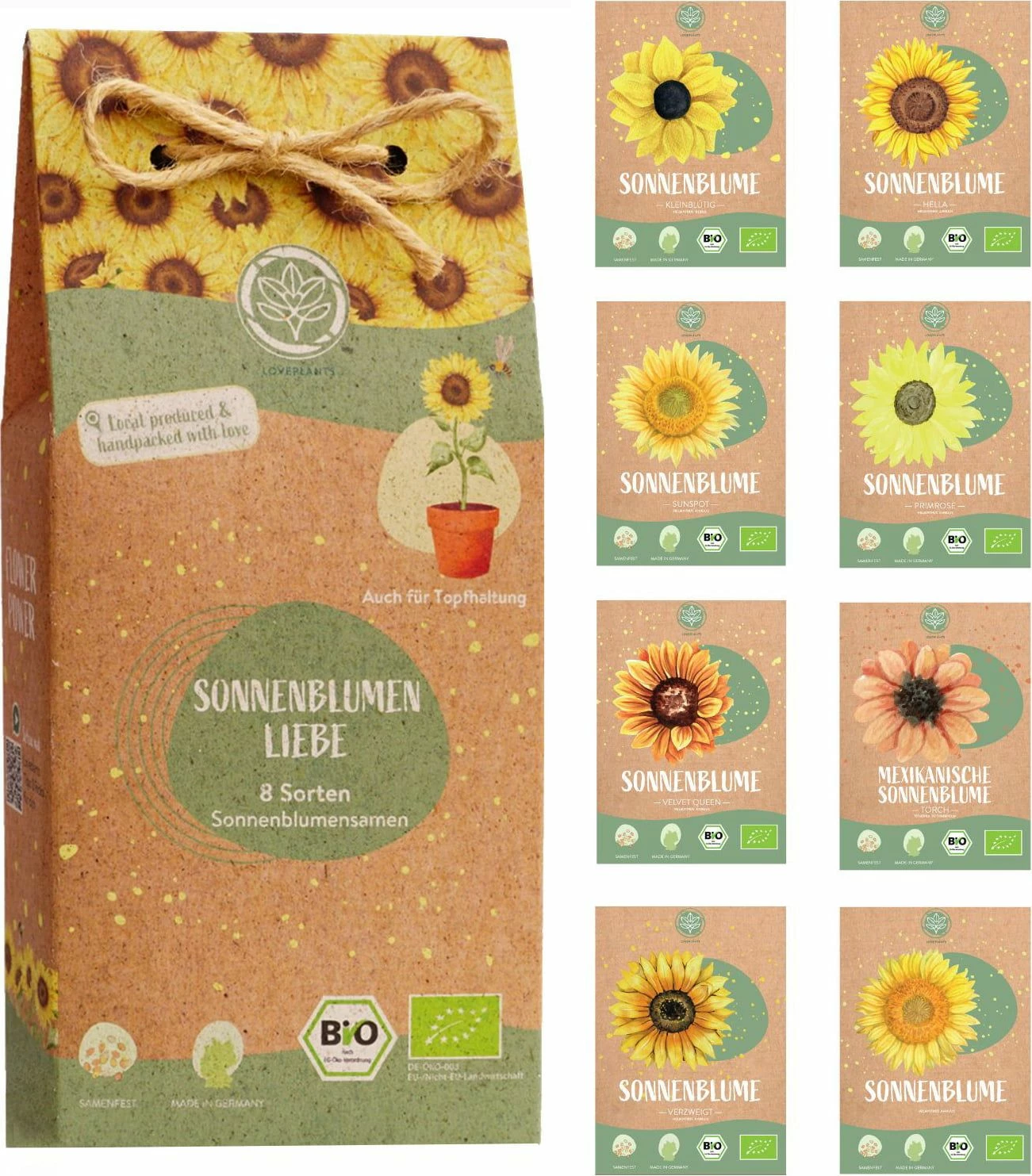 In der Geschenkverpackung befinden sich folgende 8 Sorten Bio-Saatgut (ca. 20 Korn pro Tüte):