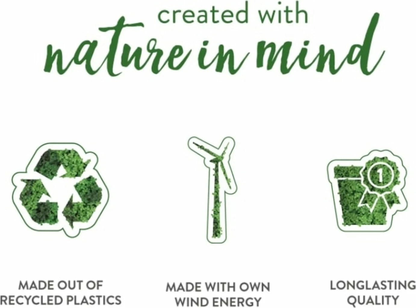 | Eigenschaften: | UV-beständig, Recycelter Kunststoff, Frostbeständig, Mit Bewässerungssystem, Wasserablauf möglich, Bruchsicher, 100 % recycelbar, Nachhaltig hergestellt, Wetterfest |