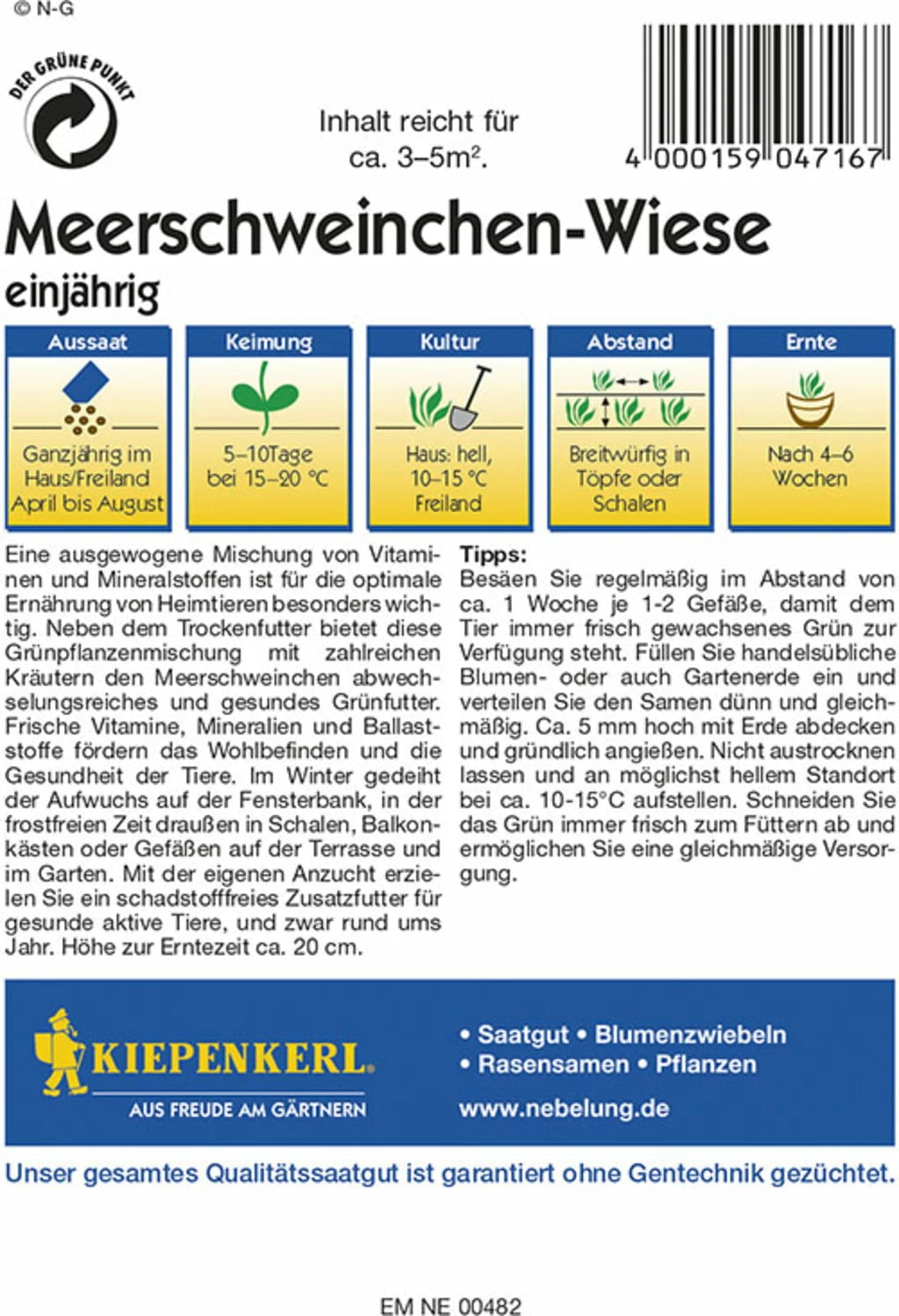 Wer seinen Meerschweinchen etwas Gutes tun möchte, der gönnt ihnen zwischendurch etwas Grünfutter. Die pelzigen Lieblinge werden deine Bemühungen zu schätzen wissen und danken es dir mit großem Appetit. Diese Mischung kannst du übrigens ganzjährig ansäen und hast daher immer frische Vitamine, Mineralien und Ballaststoffe für deine Meerschweinchen zur Verfügung.