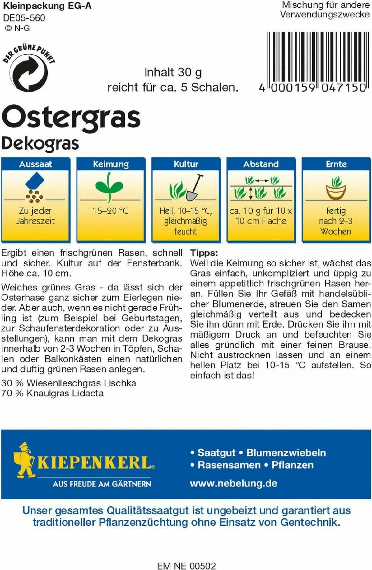 Weiches grünes Gras – da lässt sich der Osterhase ganz sicher zum Eierlegen nieder. Aber auch, wenn es nicht gerade Frühling ist (zum Beispiel bei Geburtstagen, zur Schaufensterdekoration oder zu Ausstellungen), kann man mit dem Dekogras innerhalb von 2-3 Wochen in Töpfen, Schalen oder Balkonkästen einen natürlichen und duftig grünen Rasen anlegen.